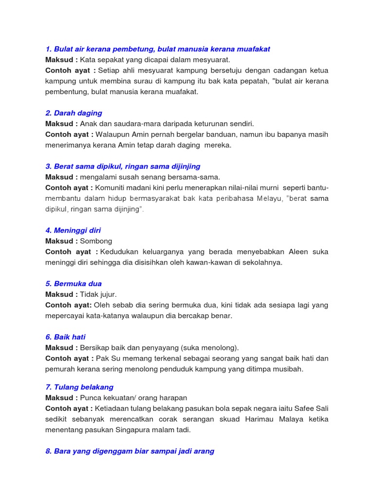 Bulat air kerana pembetung ayat. Darah daging Maksud. Kata sepakat yang dicapai dalam mesyuarat. Berat sama dipikul ringan sama dijinjing Maksud.