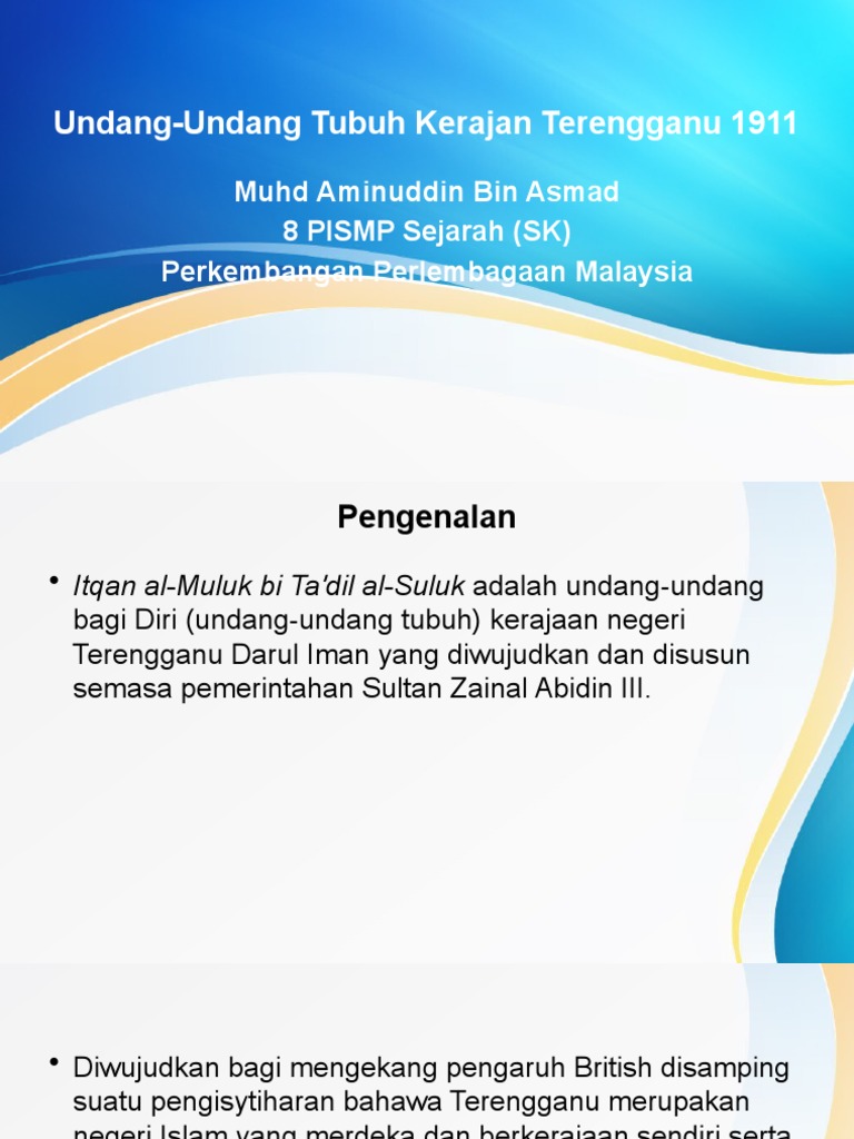 Makalah ini bertujuan meneliti Undang-undang Tubuh Perlembagaan Negeri Terengganu atau dinamakan Undang-undang Tubuh bagi Diri Kerajaan Terengganu Nama rasminya Iqtan al-Muluk bi tadil al-suluk Iqtanul Muluk. Maybe you would like to learn more about one of these. Undang-undang ini menjadi perlembagaan bagi negeri.