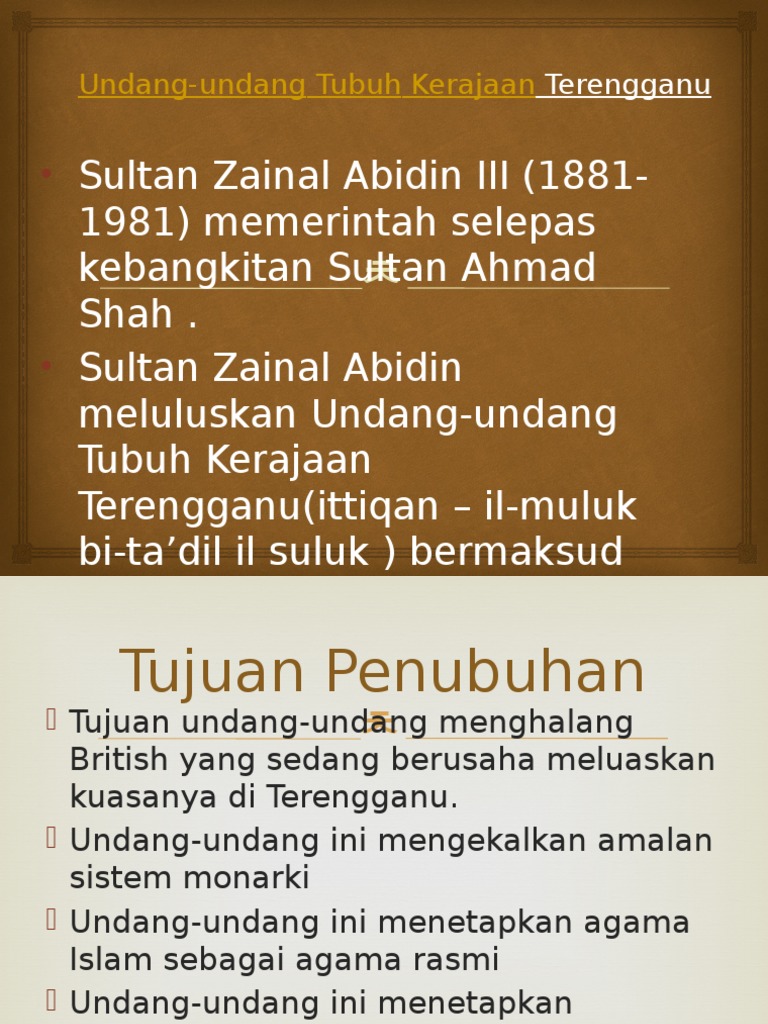 Sultan Zainal Abidin meluluskan Undang-undang Tubuh Kerajaan Terengganu ittiqan il-muluk bi-tadil il suluk bermaksud keyakinan kepada pemerintah berdasarkan keadilan. We did not find results for. Persamaan Undang Undang Tubuh Kerajaan Johor Dan Terengganu.