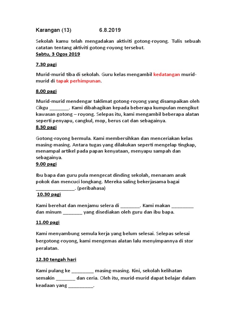 Latihan Karangan Pendek Aktiviti Gotong Royong Language Malay Grade Level Tingkatan 1 School Subject Bahasa Melayu In 2021 Malay Language Workbook School Subjects