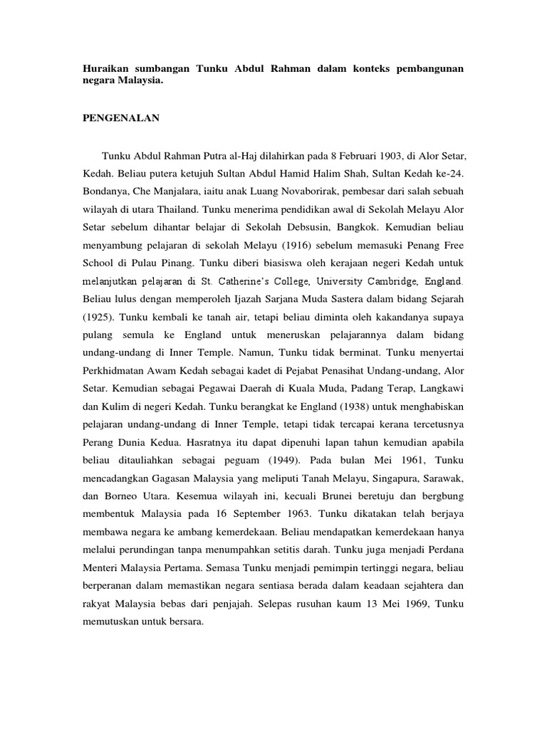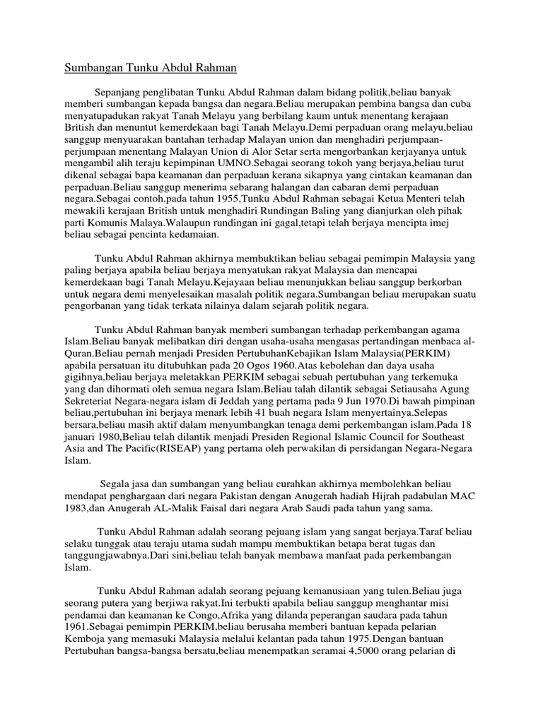 Sumbangan Tunku Abdul Docx Sumbangan Tunku Abdul Rahman Sepanjang Penglibatan Tunku Abdul Rahman Dalam Bidang Politik Beliau Banyak Memberi Sumbangan Course Hero